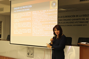 En el marco de la celebración del Día Internacional de la Eliminación de la Violencia contra la Mujer, se llevó a cabo la conferencia "El Poder Judicial como órgano garante del acceso a la justicia y protección a las mujeres víctimas de violencia", impartida por la Mtra. Claudia Indira Contreras Córdova, Vicefiscal de Feminicidios y Delitos por Razones de Género de la Fiscalía General de Justicia del Estado de Sonora.
