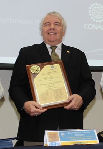 Durante la ceremonia de graduación, los alumnos Francisco Cuevas Sáenz y Arely Yovana Fox Zepeda le entregaron a nombre propio y de sus compañeros un reconocimiento especial al padrino de la generación, Magistrado Francisco Gutiérrez Rodríguez.