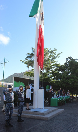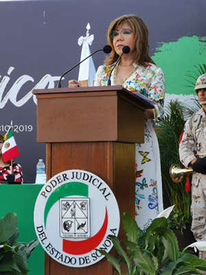 "Nosotros, Poder Judicial del Estado de Sonora, desde nuestra trinchera, tengo la certeza de que día a día hacemos patria, cuidando el legado de esos hombres de honor, que sacrificaron sus vidas para darnos libertad, pues nos corresponde la obligación histórica de asumir con valentía y entusiasmo, en nuestro desempeño laboral y profesional, la tarea de contribuir al fortalecimiento del tan anhelado estado de derecho, en sus múltiples expresiones para preservar el orden y la paz social", manifestó la Lic. Elvia Zatarain Andablo, Magistrada del Supremo Tribunal de Justicia (STJ) durante la ceremonia de izamiento de nuestro Lábaro Patrio.