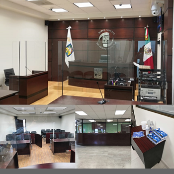 Dentro de las medidas de protección y sanidad para los usuarios del servicio de impartición de justicia, así como para todo el personal jurisdiccional y administrativo del PJE, los juzgados y vehículos oficiales han sido debidamente sanitizados, se colocaron acrílicos en las instalaciones jurisdiccionales, tapetes sanitarios, pistolas checadoras de temperatura, y también se entregaron implementos como cubrebocas, gel de alcohol y desinfectante en aerosol.