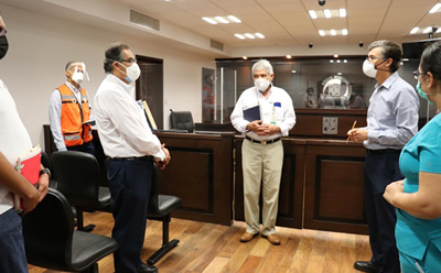 Los doctores Luis Becerra Hurtado, subdirector de Servicios Médicos; José Ramón Núñez Soto, director de Medicina Preventiva y Epidemiológica; Martín Enrique Márquez Córdova, epidemiólogo adscrito a Medicina Preventiva; y el Lic. en Enfermería Miguel del Rosario Mungaray Azpequia, todos ellos de ISSSTESON, fueron recibidos por el Magistrado Regional Jorge Luis Moreno Moreno, encargado del inmueble del edificio sede del PJE para el Programa Interno de Protección Civil, así como por el Lic. Gustavo Rivera Valenzuela, director general de Servicios Generales, la Dra. Brianda Sugey Enríquez Portela y la Lic. en Enfermería Ana Lucía Arballo Vásques.