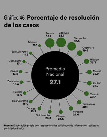 Según datos proporcionados por México Evalúa, de acuerdo a solicitudes de información hechas por esta misma organización, el promedio de resolución de casos en sede judicial, es decir, las causas penales que fueron finalizadas durante 2019, fue del 27.1 por ciento.