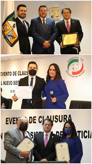 También se entregó un reconocimiento especial al padrino de la primera generación de funcionarios del Poder Judicial Sonorense capacitados en el Nuevo Sistema de Justicia Laboral, el Mtro. Alejandro Bustamante Silvas, Secretario Ejecutivo de Presidencia del STJ y del Consejo del PJE, por constituir un digno ejemplo de trabajo, perseverancia y lealtad, así como por su gran labor como principal promotor de la formación, capacitación y especialización judicial de los funcionarios públicos del PJE.