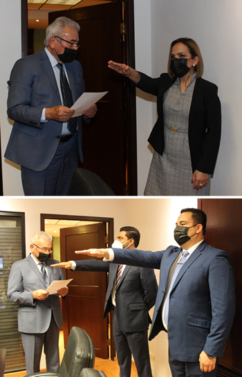 En la misma ceremonia el Pleno del STJ, por conducto de su Presidente, Magistrado Rafael Acuña Griego, tomó protesta a los licenciados Jesús Abraham Amparo Martín y Edgar Alejandro Domínguez Villapudua como Jueces de Primera Instancia quedando adscritos al Juzgado Oral Mercantil de Cajeme y Juzgado Oral Penal de San Luis Río Colorado respectivamente.