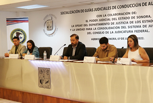 El Poder Judicial del Estado de Sonora (PJE), presentó las "Guías Judiciales de Conducción de Audiencias Penales" a los diferentes operadores del Sistema de Justicia Penal Acusatorio, en un evento organizado en colaboración con la Oficina Internacional para el Desarrollo, Asistencia y Capacitación (OPDAT) del Departamento de Justicia de la Embajada de los Estados Unidos y la Unidad para la Consolidación del Nuevo Sistema de Justicia Penal (UCNSJP) del Consejo de la Judicatura Federal, el pasado jueves 7 de julio.