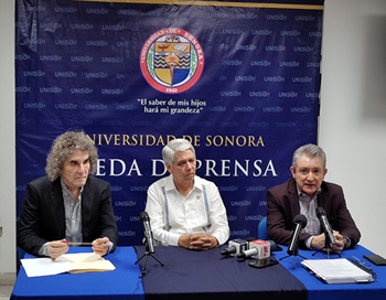 Durante la rueda de prensa para dar a conocer los detalles sobre el evento, estuvieron presentes el Lic. Octavio Eduardo González Domínguez, Magistrado Regional de Circuito del Supremo Tribunal de Justicia (STJ); el Dr. Héctor Guillermo Campbell Araujo, Jefe del Departamento de Derecho de la Unison; y el Dr. Jorge Pesqueira Leal, Docente Investigador de la Unison.