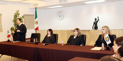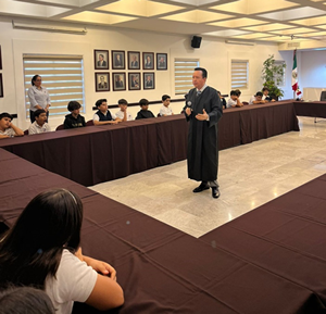 Los alumnos fueron recibidos por el Magistrado Rafael Acuña Griego, Presidente del Supremo Tribunal de Justicia (STJ), quien los saludó y dio la bienvenida acompañado de la Magistrada Elvia Zatarain Andablo; del Lic. César Saúl García Acosta y la Lic. Evangelina Cinco Sosa, Magistrados Regionales de Circuito; así como de la Lic. María del Carmen Soto Esquer, Jueza del Juzgado Tercero Familiar de Hermosillo.