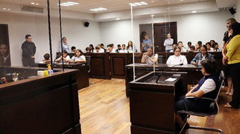 Como parte de la visita, los niños y niñas tuvieron la oportunidad de realizar una simulación de un juicio oral interpretando el papel de cada una de las partes que intervienen dentro de una audiencia.