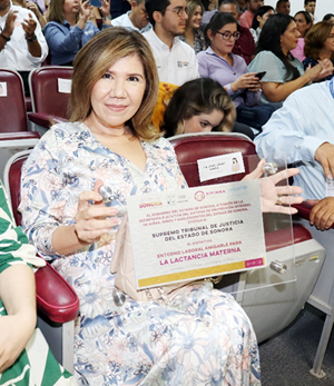 La Magistrada Elvia Zatarain Andablo, representando al Poder Judicial del Estado, recibió dicho reconocimiento que se otorgó a dependencias de gobierno en sus distintos niveles y a empresas privadas que cuentan con salas de lactancia para que madres trabajadoras puedan extraerse leche materna en un espacio digno e higiénico sin tener que salir de su centro laboral, promoviendo así políticas que protejan y faciliten la lactancia en Sonora.