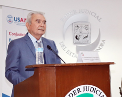 El Magistrado Presidente Rafael Acuña Griego, dirigió un emotivo mensaje en el que agradeció al Licenciado Leonardo Escobar, D irector General; a Martín Bravo y todo el equipo de colaboradores del Programa ConJusticia, por su invaluable apoyo al compartir su conocimiento y experiencia a todas y todos los participantes del taller. Agradeció también, de manera muy especial, a quienes participaron en las actividades realizadas por su dedicación, esfuerzo e interés, exhortándolos a aplicar la metodología de análisis y los valores aprendidos al emitir sus determinaciones, de tal forma que sus resoluciones satisfagan las expectativas de las personas de recibir justicia y pongan en evidencia estar comprometidos y ser sensibles; que a través de sus fallos emitan el firme mensaje de que no habrá impunidad para quienes lesionen los valores y derechos de otras personas.