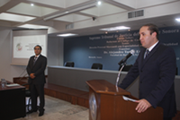 El Presidente del STJ, Mgdo. Juan Sebastián Sotomayor Tovar, al momento de presentar al expositor y de saludar a los asistentes en el auditorio y a la transmisión de la videoconferencia. |