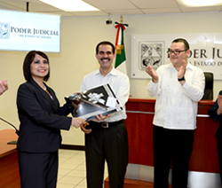 El Gobernador del Estado entregó a la Lic. Gloria Soledad Conde el mallete o mazo que la juez utilizará para dejar iniciados o terminados los trabajos en la sala de audiencias así como para llamar al orden y a mantener la solemnidad durante el juicio.