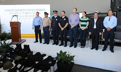 Durante el evento que tuvo como fin el fortalecer las capacidades operativas y tácticas de la PESP, se hizo entrega de 15 unidades inteligentes tipo sedán que cuentan con cámaras de video, sistema de GPS y sistema de cómputo, así como 10 vehículos blindados, uniformes, botas y chalecos.